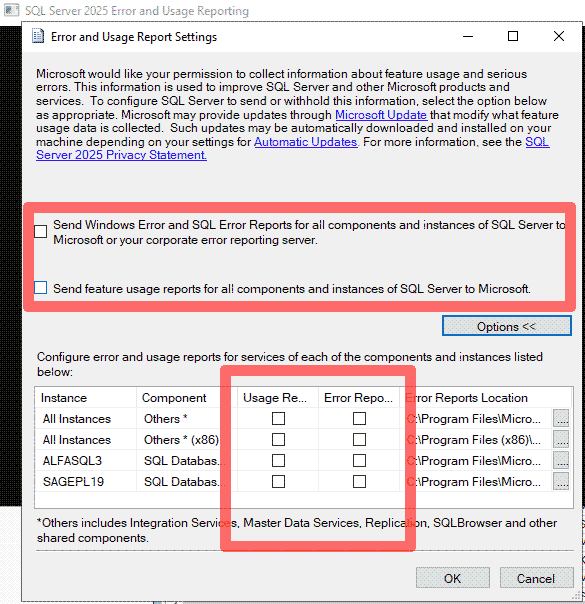 W systemie SQL Server 2016 firma Microsoft domyślnie instaluje usługi SQL Server Telemetry lub CEIP (Customer Experience Improvement Program).Wysyłają one informacje o użyciu funkcji do firmy Microsoft.Nie można pominąć instalacji tych usług.Zauważyłem, że większość administratorów baz danych nawet nie wie, że zainstalowali tę usługę na swoim hoście.Jeśli zastanawiasz się, jak ją wyłączyć, wykonaj poniższe kroki (jak na obrazku)